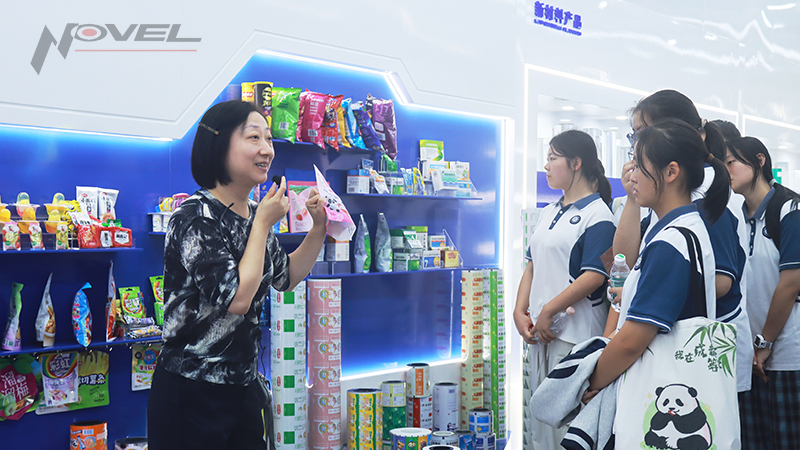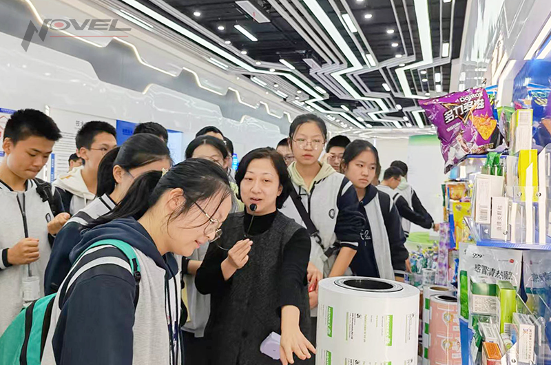 座談結(jié)束,在工作人員的帶領(lǐng)下,研學(xué)團隊先后參觀了永新股份展廳和MES系統(tǒng)控制中心。展廳內(nèi),各品類包裝產(chǎn)品、高性能薄膜琳瑯滿目,從食品包裝到工業(yè)應(yīng)用,從環(huán)保材料到智能包裝,工作人員詳細(xì)介紹了產(chǎn)品的研發(fā)過程、性能特點及應(yīng)用領(lǐng)域,讓同學(xué)們直觀感受到包裝材料的多樣“膜”力。MES系統(tǒng)控制中心內(nèi),永新股份信息部經(jīng)理王健與同學(xué)們進(jìn)行互動問答,現(xiàn)代化的智能管理界面實時呈現(xiàn)著生產(chǎn)全流程數(shù)據(jù),同學(xué)們紛紛感嘆工業(yè)智能化帶來的高效與精準(zhǔn)。